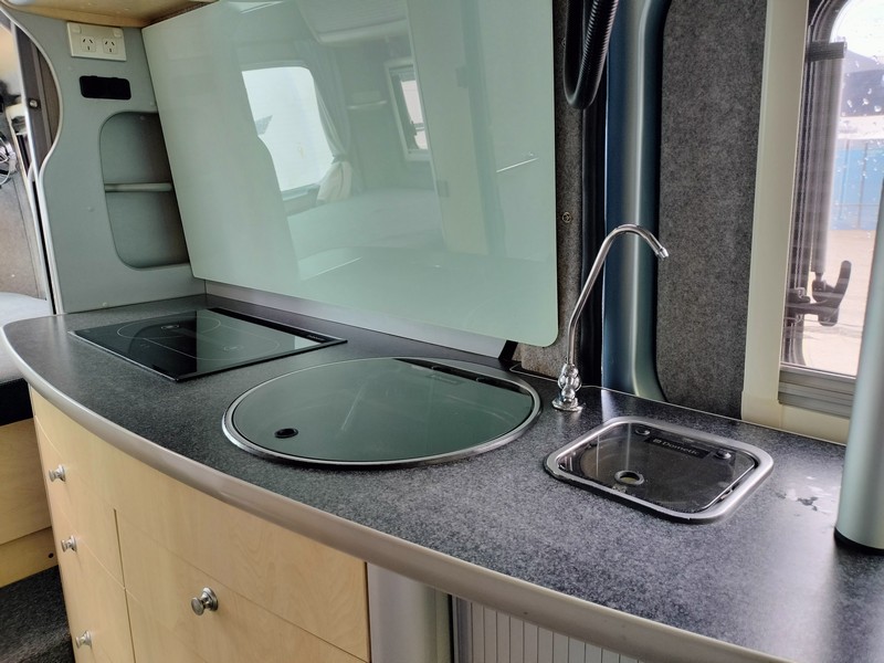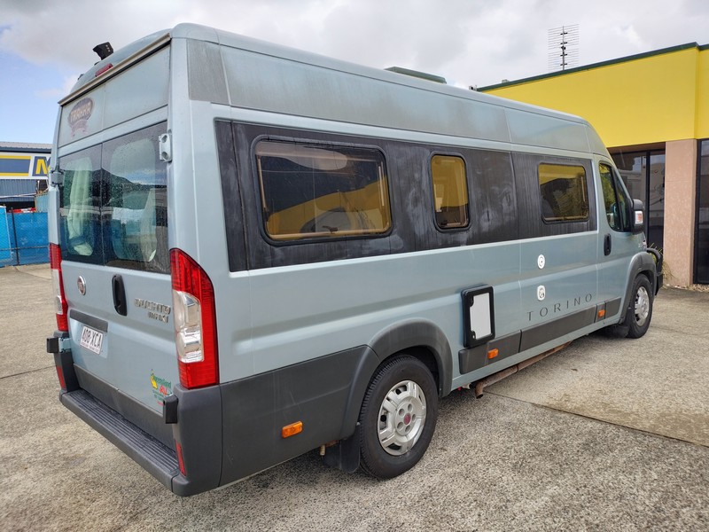 2014 Fiat Ducato 3.0L turbo diesel, automatic transmission, shower/toilet, reversing camera, GPS, bull bar, wind-out awning, solar system, dual house batteries, combination heater & hot water service, East/West rear bed with electric height adjustment, flat screen DVD monitor, diesel cooktop. 12v compressor fridge (raised), swivel front seats. Travelled 76,800kms. No-gas campervan. CONSIGNMENT STOCK has no Statutory Warranty or cooling off period. $77,700+orc, $79,990 Drive Away.