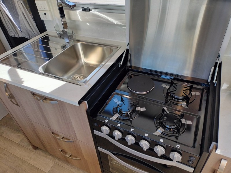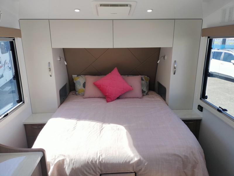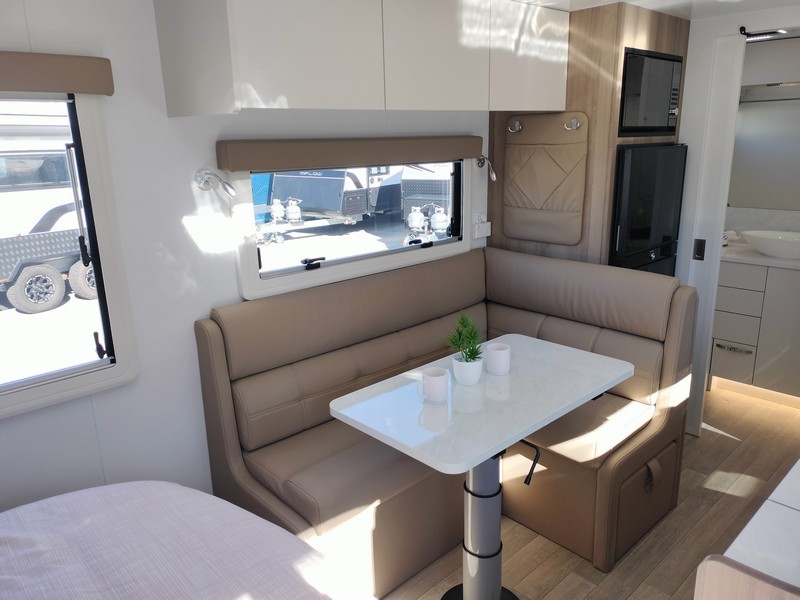Front island bed, rear ensuite with separate shower & toilet, huge rear 4 person café dinette, 188L TR compressor 2-door fridge/freezer, cooktop/oven/grill, microwave, 2.5kg front loading washing machine, 24” flatscreen TV, Winegard Sensar antenna, 12V ports, inline water filter, stainless deep bowl sink, all LED lighting, retractable insect & solar screens. Tare 2503kg, ATM 3000kg, B/weight tare 220kg. $94,990 Tow Away