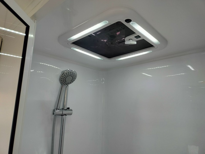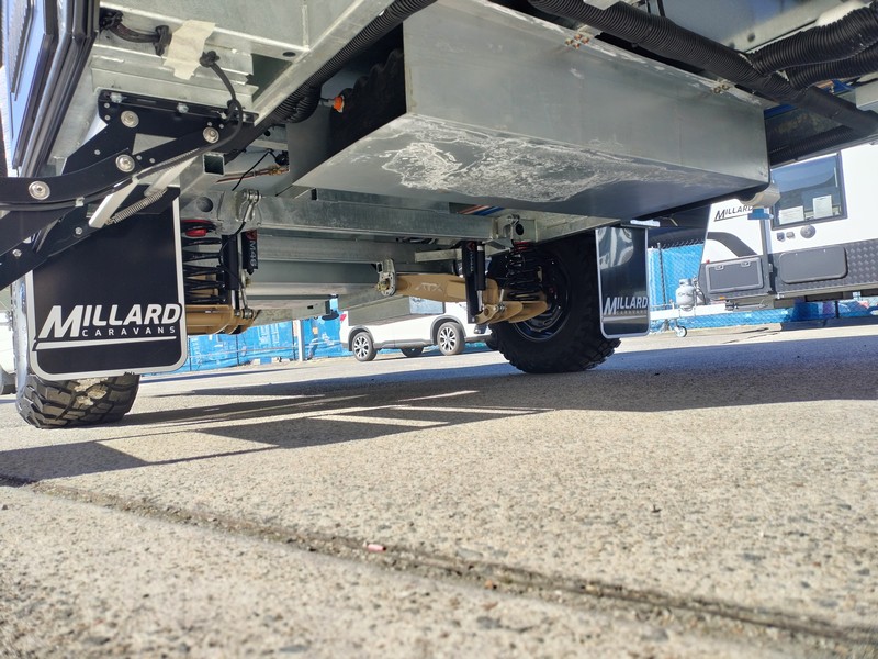 Aluminium wall frames, one piece fibreglass sandwich panel roof, hot gal dipped Blue Steel chassis, honeycomb flooring, 16inch mud terrain tyres, Cruisemaster ATX independent suspension, 2x 200w solar panels, 1x125amp BTech Lithium battery with 2000w inverter, BMPro Aspero management system with Odyssey touch screen, reverse cycle air conditioner, 2x95L freshwater tanks, 1x100L grey water tank, 2x9kg gas bottles, dust reduction system, front toolbox with slide, roll-out awning, gas electric hot water system, external shower, gas bayonet, tunnel boot, DO35 hitch, reverse camera (with in-car kit), light bars front & rear, external speakers, electronic stability control, diesel heater.