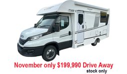 NEW 2025 Iveco 4cyl 3.0ltr Turbo Diesel * full automatic transmission * reversing camera * 2 x solar panels * 2 x house batteries * drop down electric bed * separate shower/toilet * 3 burner gas cooker with grill * rear tunnel boot storage * flat screen TV with antenna * 150ltr compressor fridge * wind-out awning * gas/electric hot water system * roof air conditioning * electric entry step * can be driven on a standard car licence.