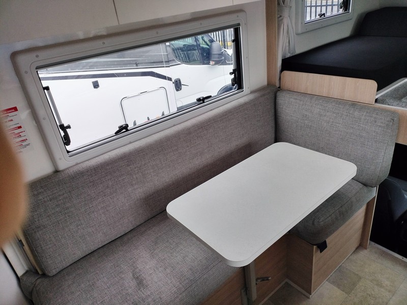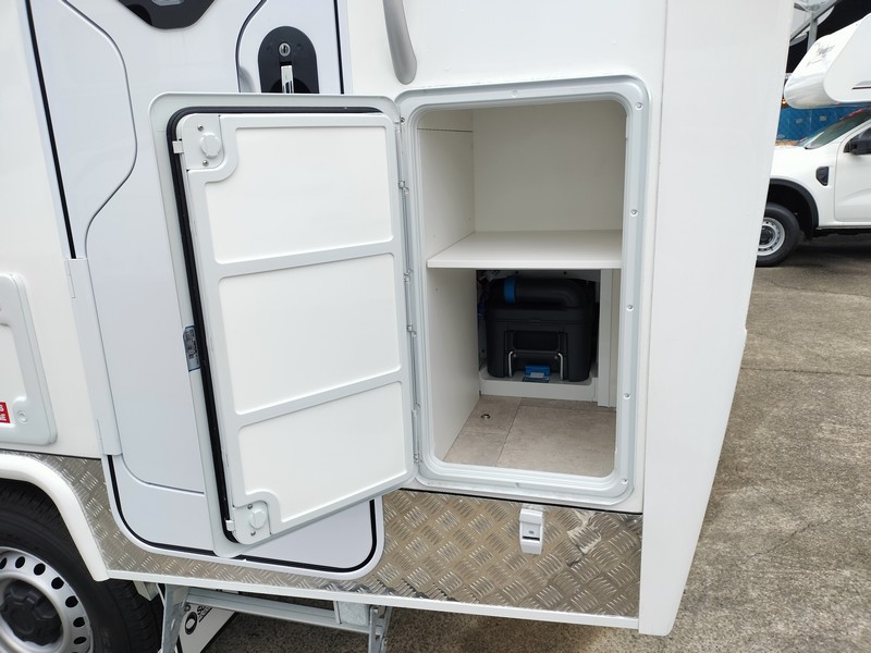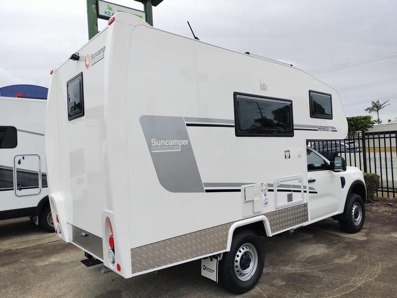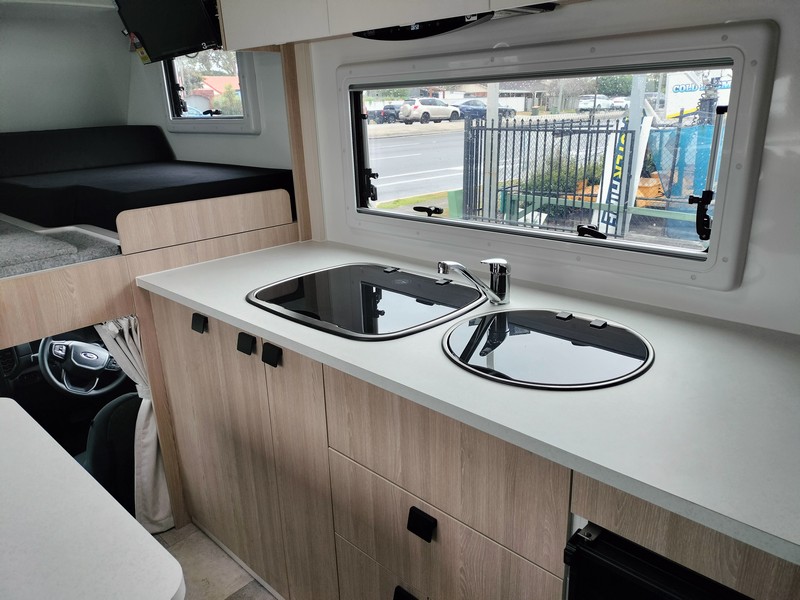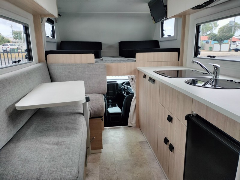 Built on a Ford Ranger Hi Rider 4×2 chassis, it has: turbo diesel, automatic transmission, GVM upgrade, reversing camera, rear separate shower & toilet, roof mounted reverse cycle air conditioning, single beds over cabin, 2x solar panels, 2x house batteries, electric entry step, gas/electric hot water system, 112L 12v compressor fridge, roof antenna, flatscreen TV, gas stove and a large L-shaped lounge/dining facility. $152,20+orc, $161,000 Drive Away