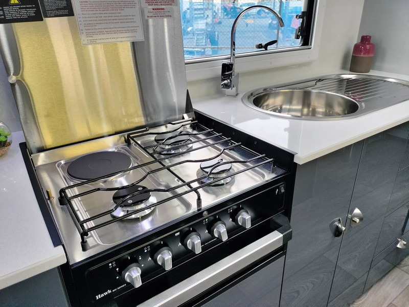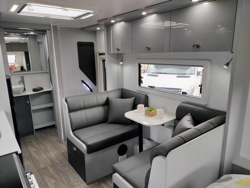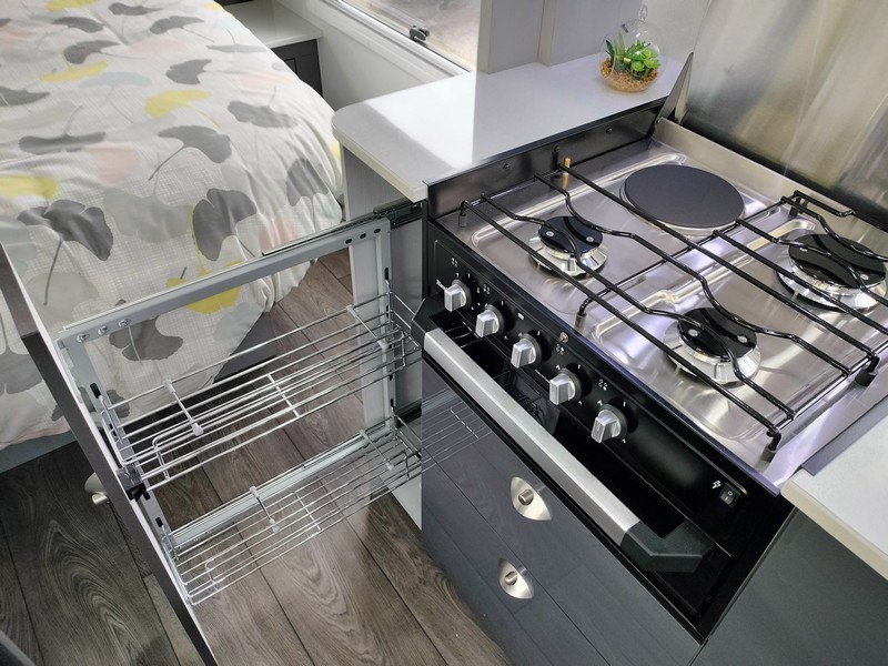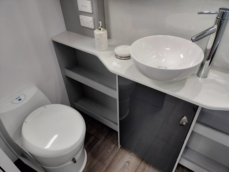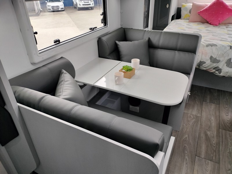 With the Conifer 5228 semi-off road caravan, you can enjoy lightweight towing with all the comfort and features of a much larger van. Features include: One piece composite walls & floor, one piece insulated honeycomb floor, rooftop reverse cycle air condition, front island bed with innerspring mattress, café dinette with tri-fold table, 177L Thetford 3-way fridge, 3 gas/1 electric burner cooktop with mini0grill, 12v rangehood, large cutlery drawer, stainless sink with Flickmixer tap, microwave (no turntable), full ensuite with separate shower & toilet, flatscreen TV and house sound system with Bluetooth.