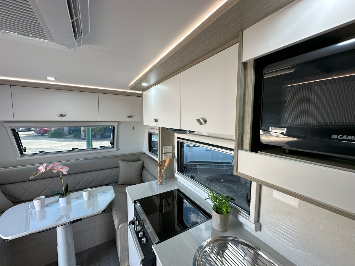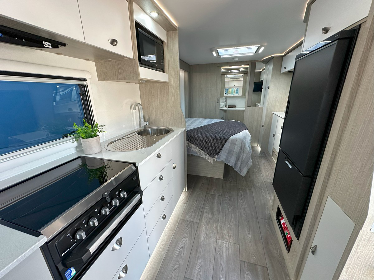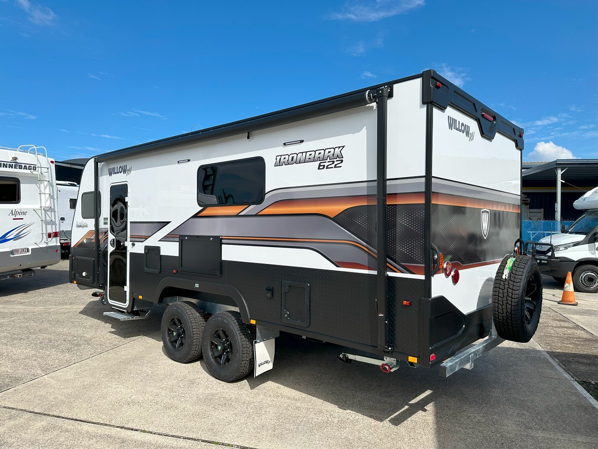 The Ironbark has a long list of features to ensure your trip is all about the leisure.Modern and Contemporary Style Furniture * Leather Seat Coverings. Thetford Fridge 170 Litres 12vI240v * Reverse Cycle Roof Top Air Conditioner * Microwave * Rangehood with 12v Twin Fans and Lighting * 24″ LED TV * TV Antenna * Washing Machine. * 6″ Fully Hot Dipped Galvanised Chassis * 6″ Reinforced Cross Members * Electric Drum Brakes * AL-KO EnduroX Suspension. Single 200-watt Solar Panels and Regulator * 100AH Deep Cycle Battery. Twin 95 Litre Water Tanks with Guard Protection * 20 Litre Hot Water System with Dual Operation Gas/240v * Dual 9kg Gas Bottles * Gas Bayonet Connection. Instaltuff Hail-Resistant One-Piece Composite Panels for Roof/Sides/Rear * One-Piece Honeycomb Floor * AL-KO Off Road Coupler * Roll-Out Awning * Picnic Table * External Entertainment Hatch. AUSTRALIAN MADE. * Tare 2437kg * Ball Weight 220kg * ATM 3200kg $109,990.00 Tow Away